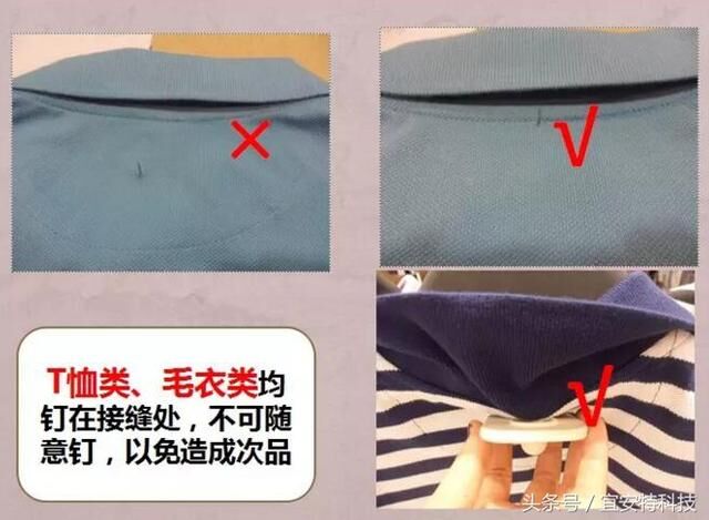 T恤類,毛衣類均釘在接縫處,不可隨意釘,以免造成次品。