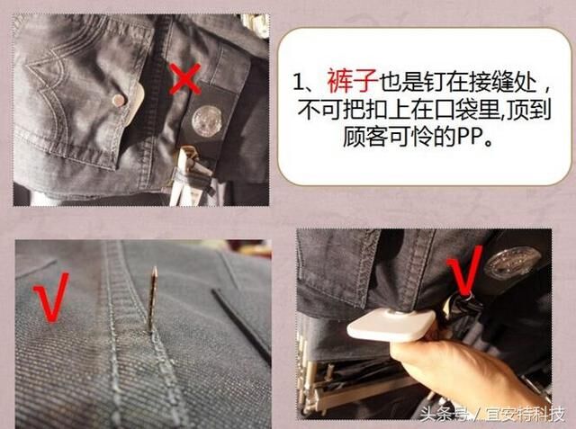 為防止丟貨,許多店鋪都安裝了防盜器,因此也就有了需要給商品上防盜扣的工作。然而看似簡(jiǎn)單的一個(gè)上扣動(dòng)作,有時(shí)沒有考慮清楚,隨意的上扣容易使衣服受損,產(chǎn)生次品!那怎樣上扣才是正確的呢?接下來為您揭秘上扣技巧。